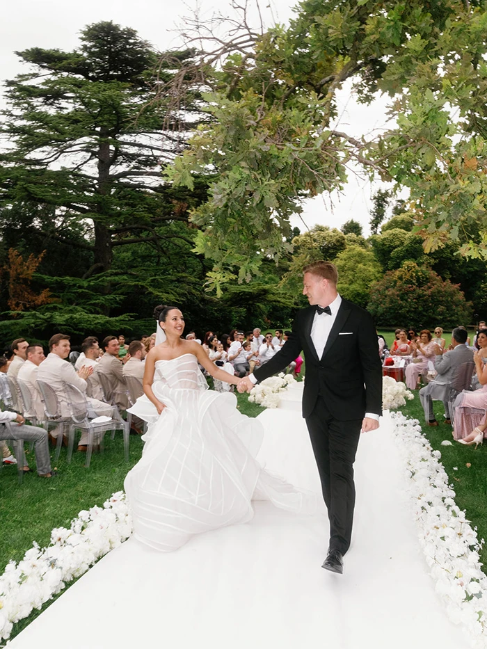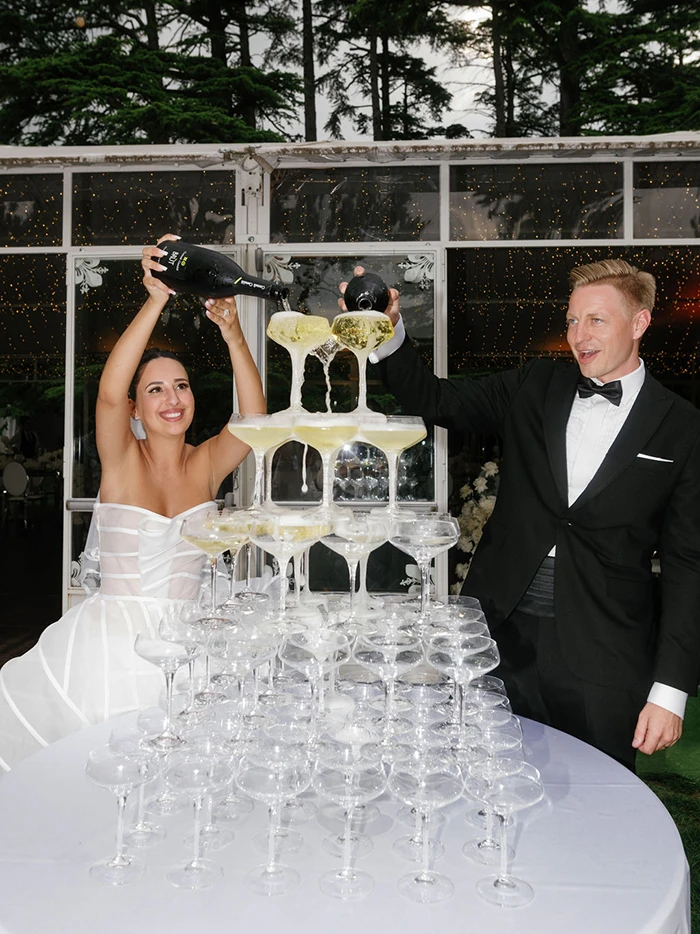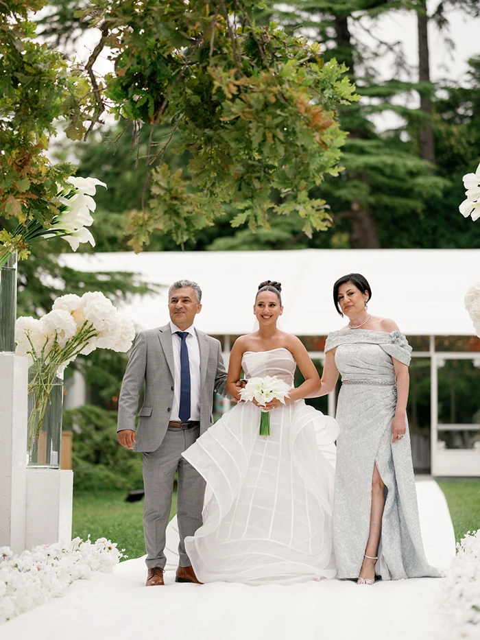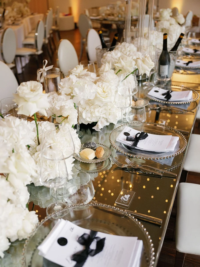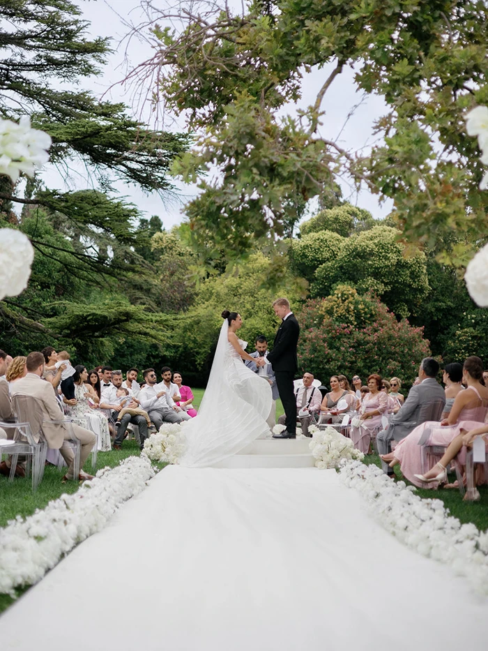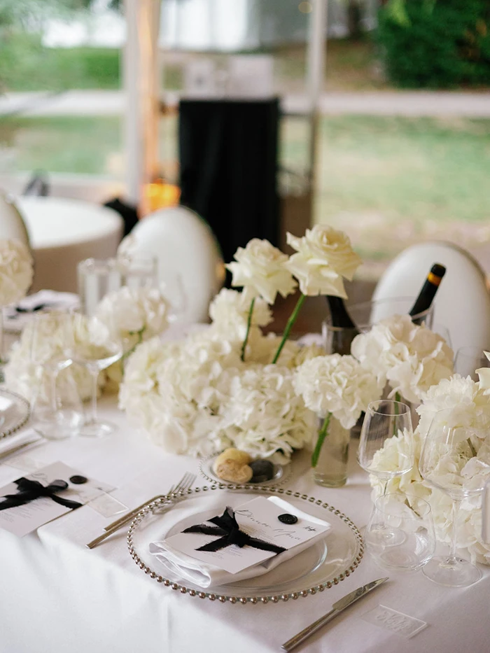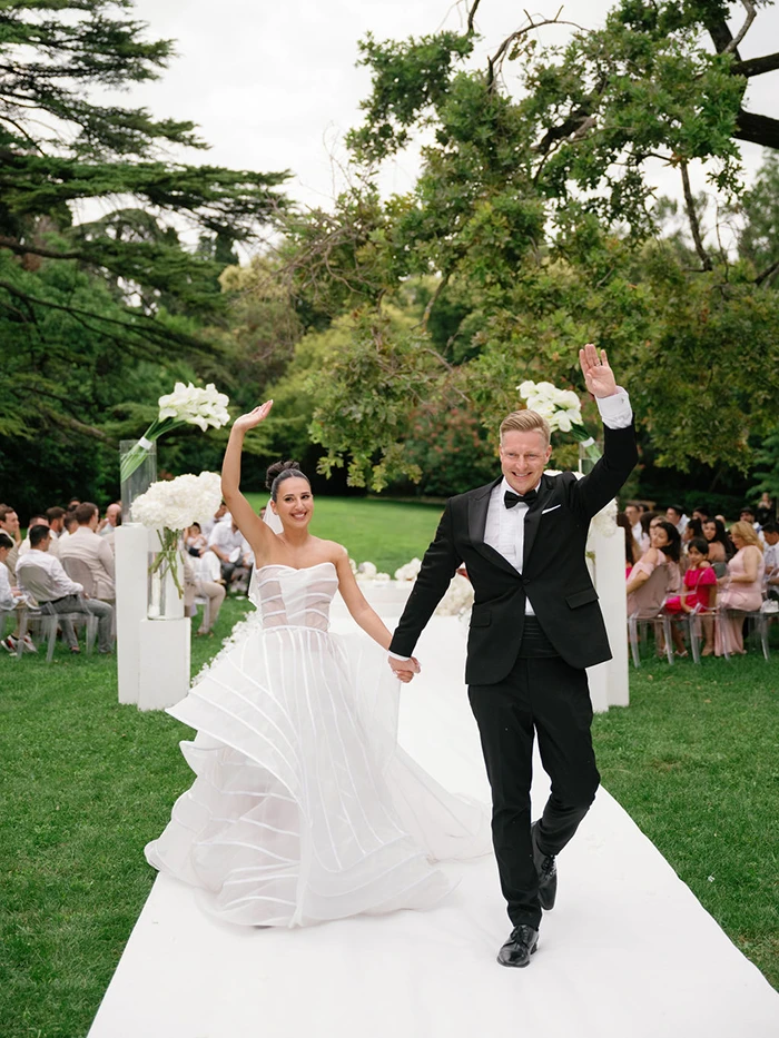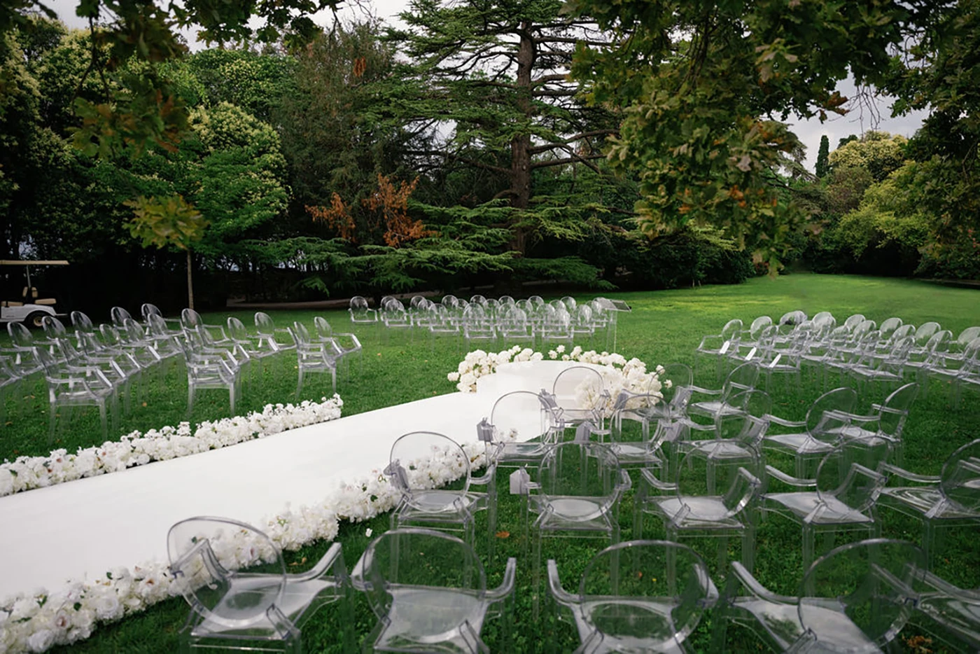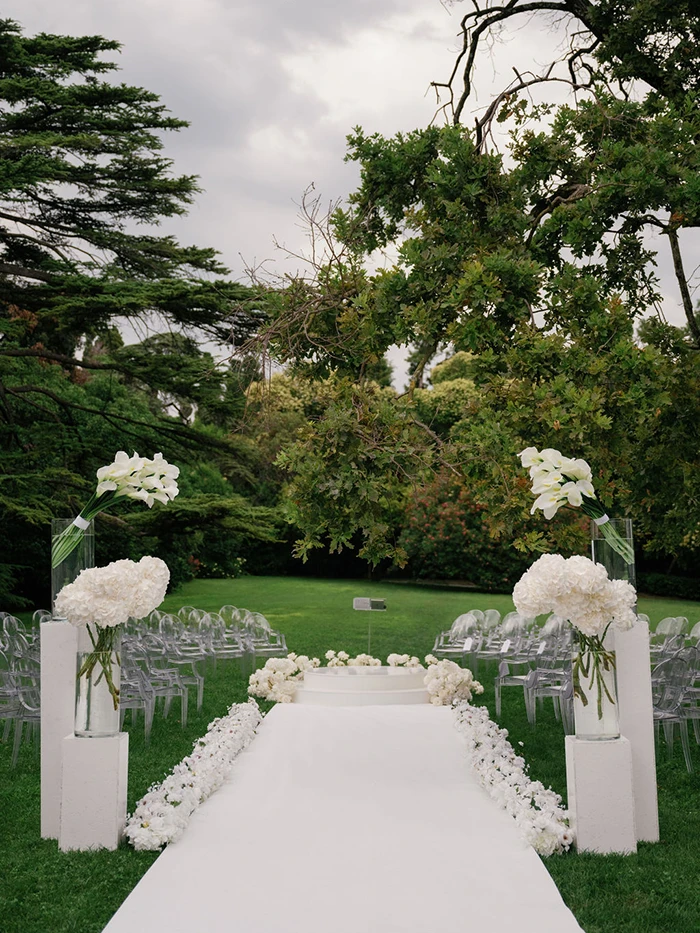 As guests arrived by boat, they were greeted by the breathtaking splendor of gardens and the historic architecture of a palazzo resting on the lake’s waters. The modern, minimalist black-andwhite palette chosen by Nicole and Alex stood out beautifully against the natural backdrop of the island’s park.