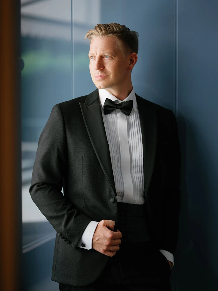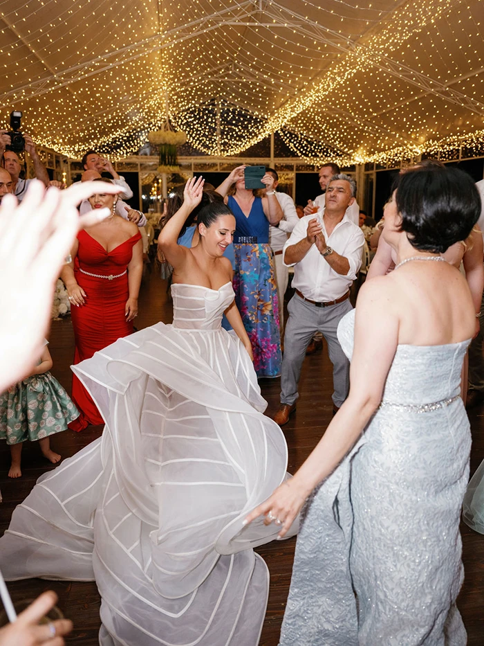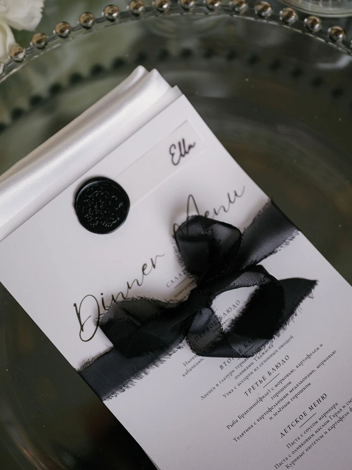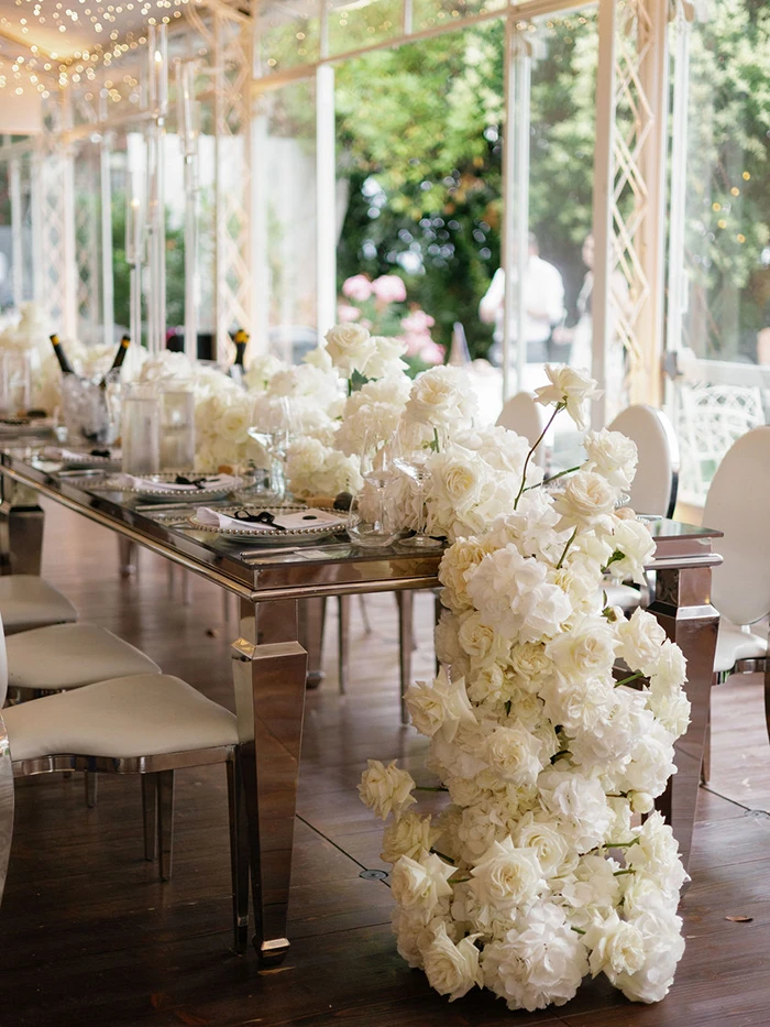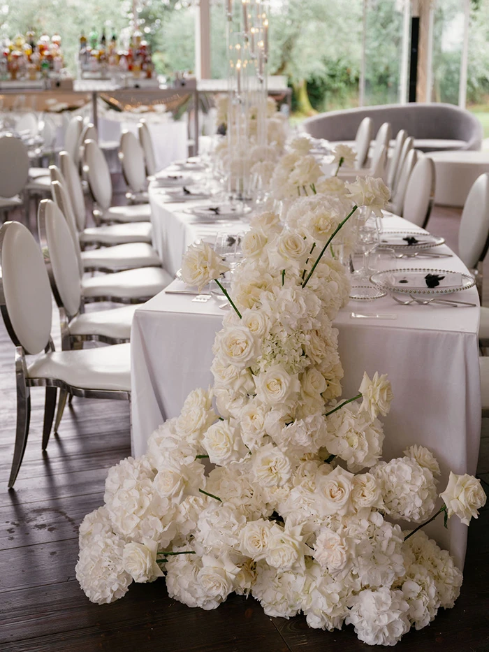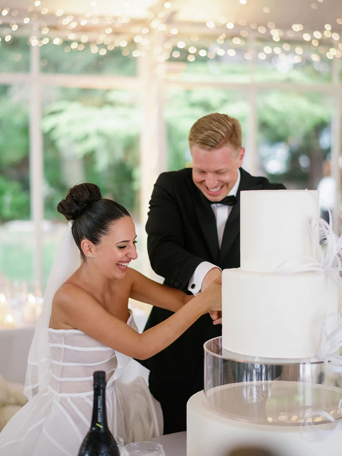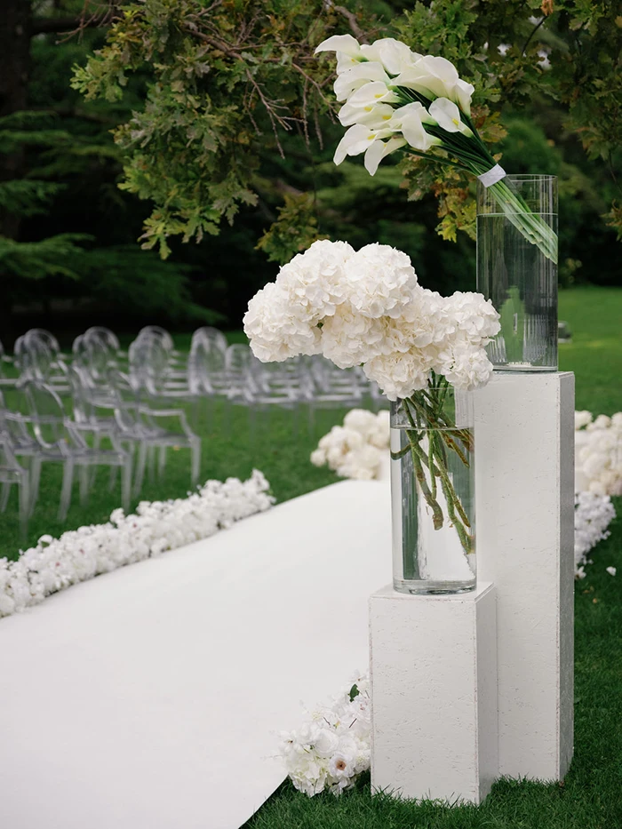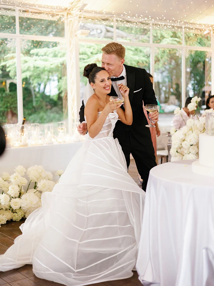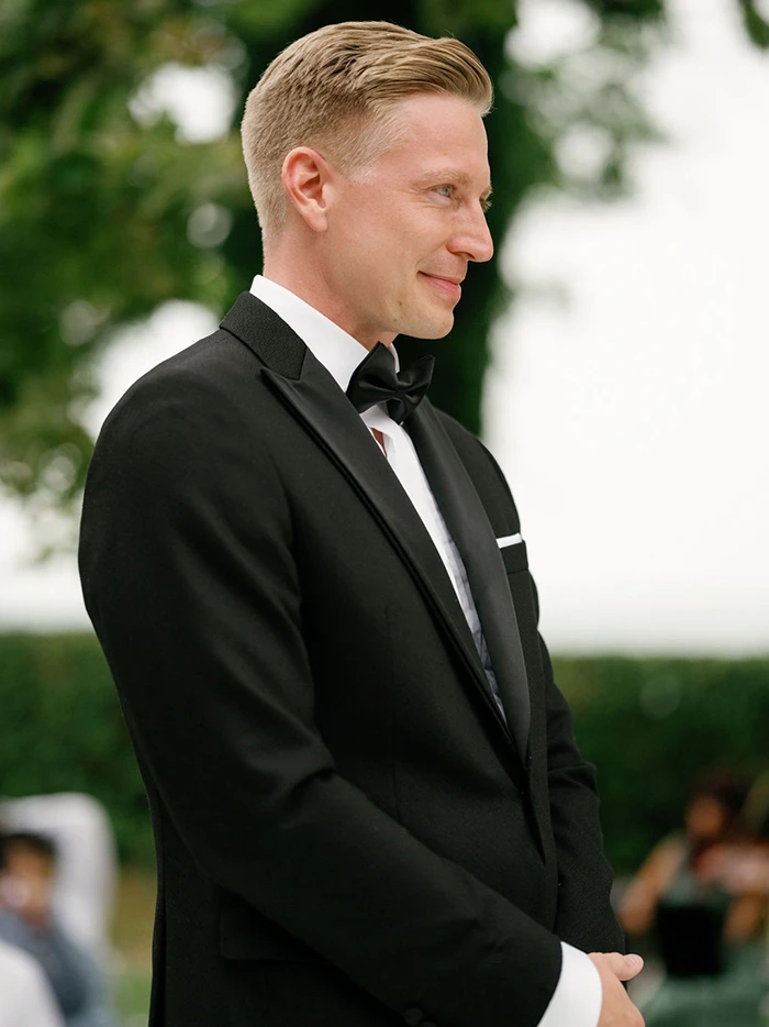 As guests arrived by boat, they were greeted by the breathtaking splendor of gardens and the historic architecture of a palazzo resting on the lake’s waters. The modern, minimalist black-andwhite palette chosen by Nicole and Alex stood out beautifully against the natural backdrop of the island’s park.