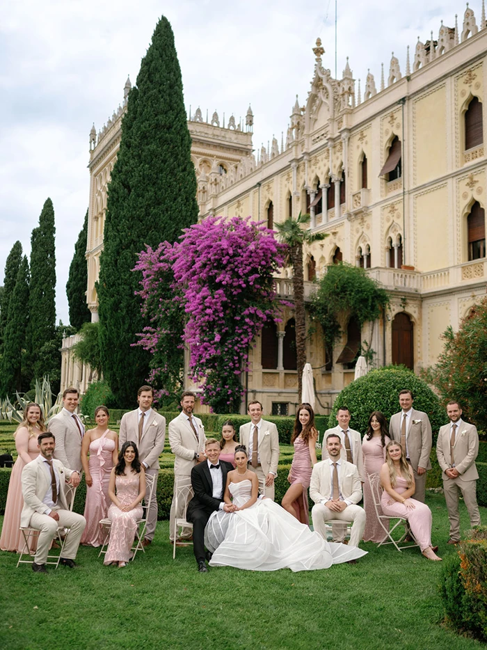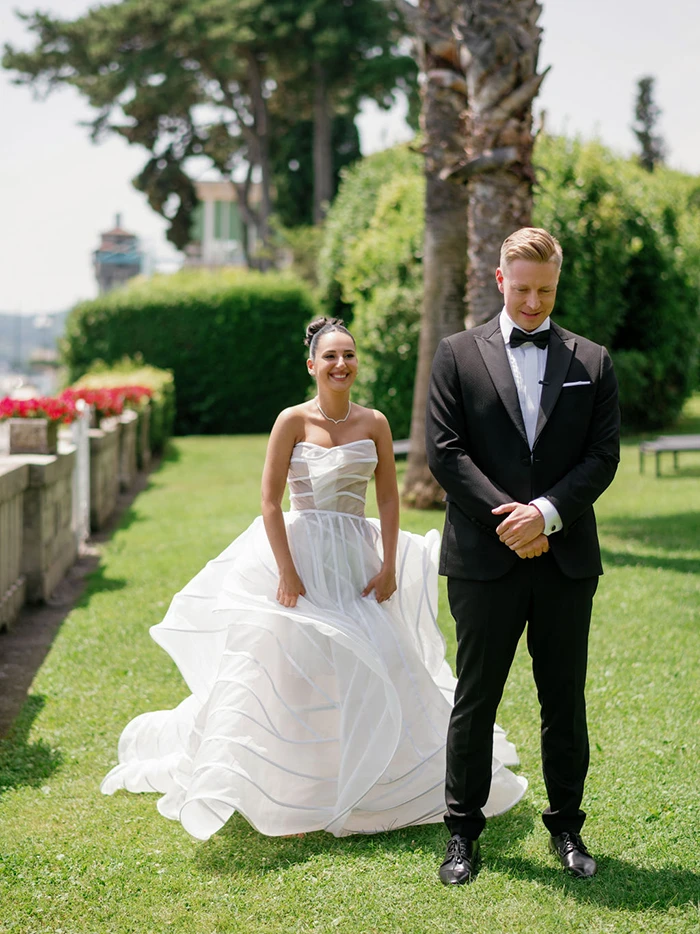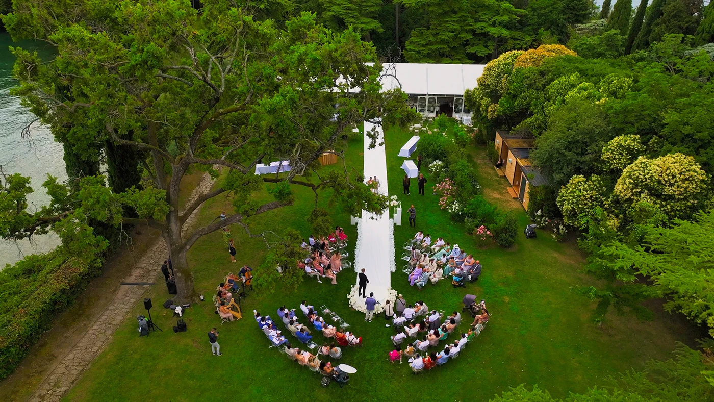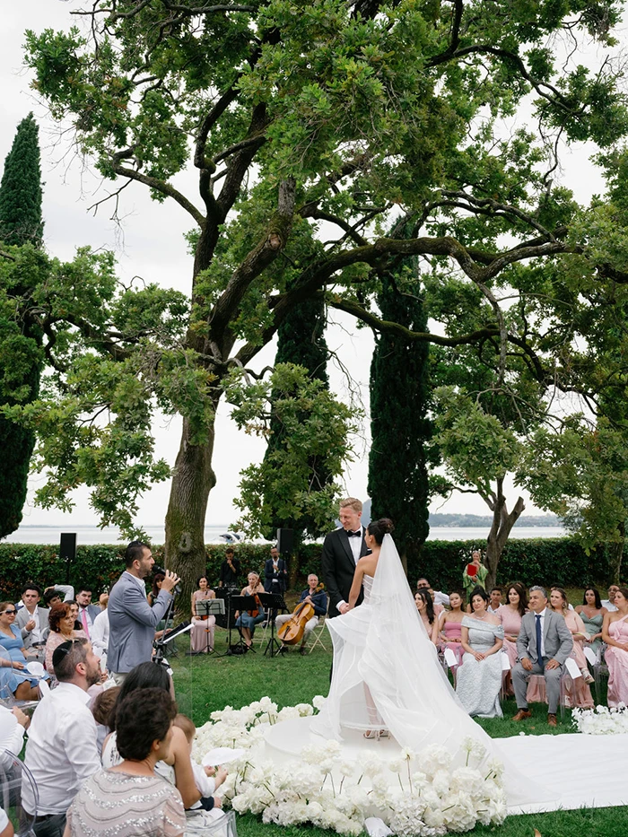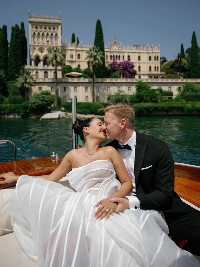 When Nicole and Alex first came to us, they were full of excitement and anticipation for their wedding day. Their vision? A sophisticated summer wedding on Lake Garda that would celebrate not only their love but also the union of two different cultures and traditions. The venue? The oneof-a-kind Isola del Garda, serving as the stunning backdrop for relatives and friends traveling fromopposite corners of the world.