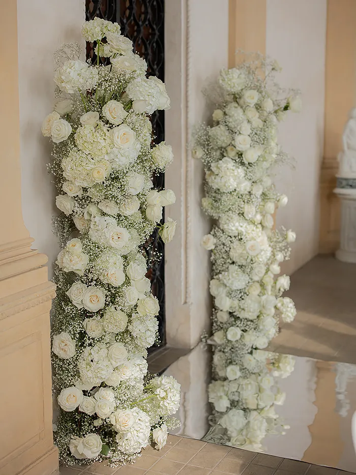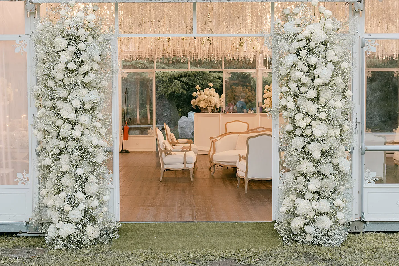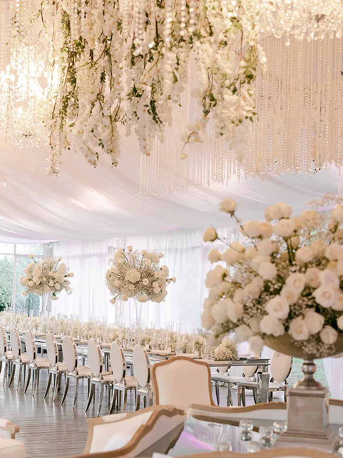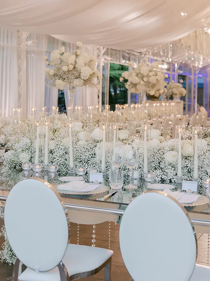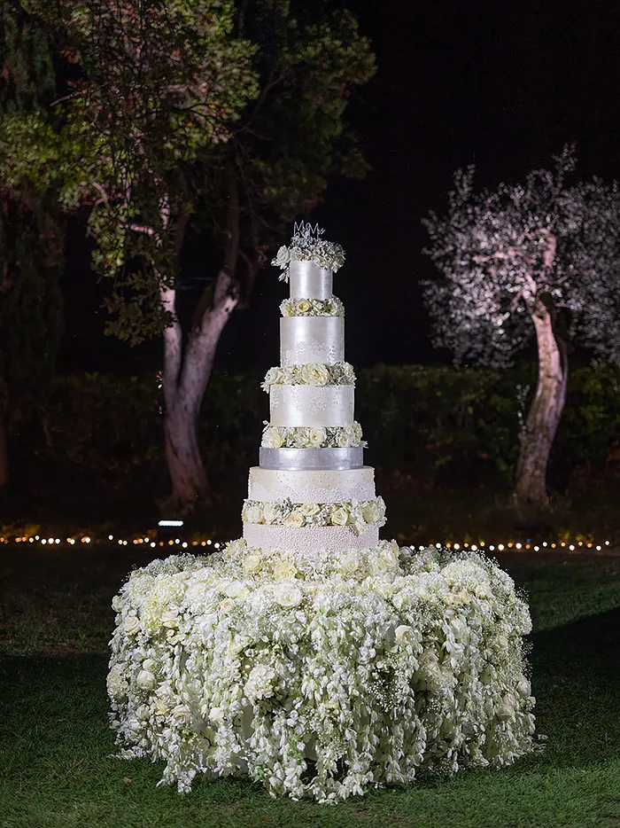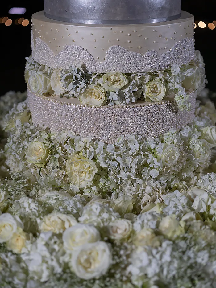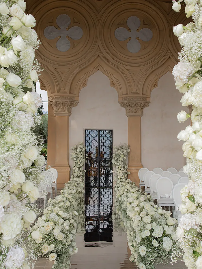 The decorations we crafted for the most special day of their celebration featured thousands of ivory roses, shimmering diamonds and pearl cascades, and a striking mirrored aisle for the ceremony in the loggia overlooking the lake. For the reception, the marquee in the park was transformed with meters and meters of white silk draping, creating an elegant setting for the imperial mirrored tables. What better sweet ending than a monumental wedding cake adorned with cascading flowers and pearls, completing a perfect day of romance and luxury.