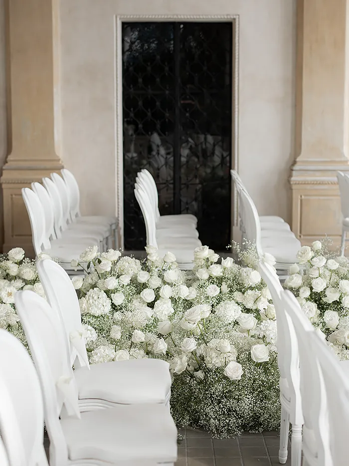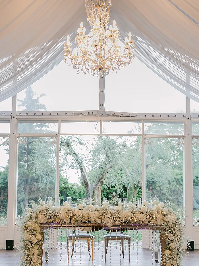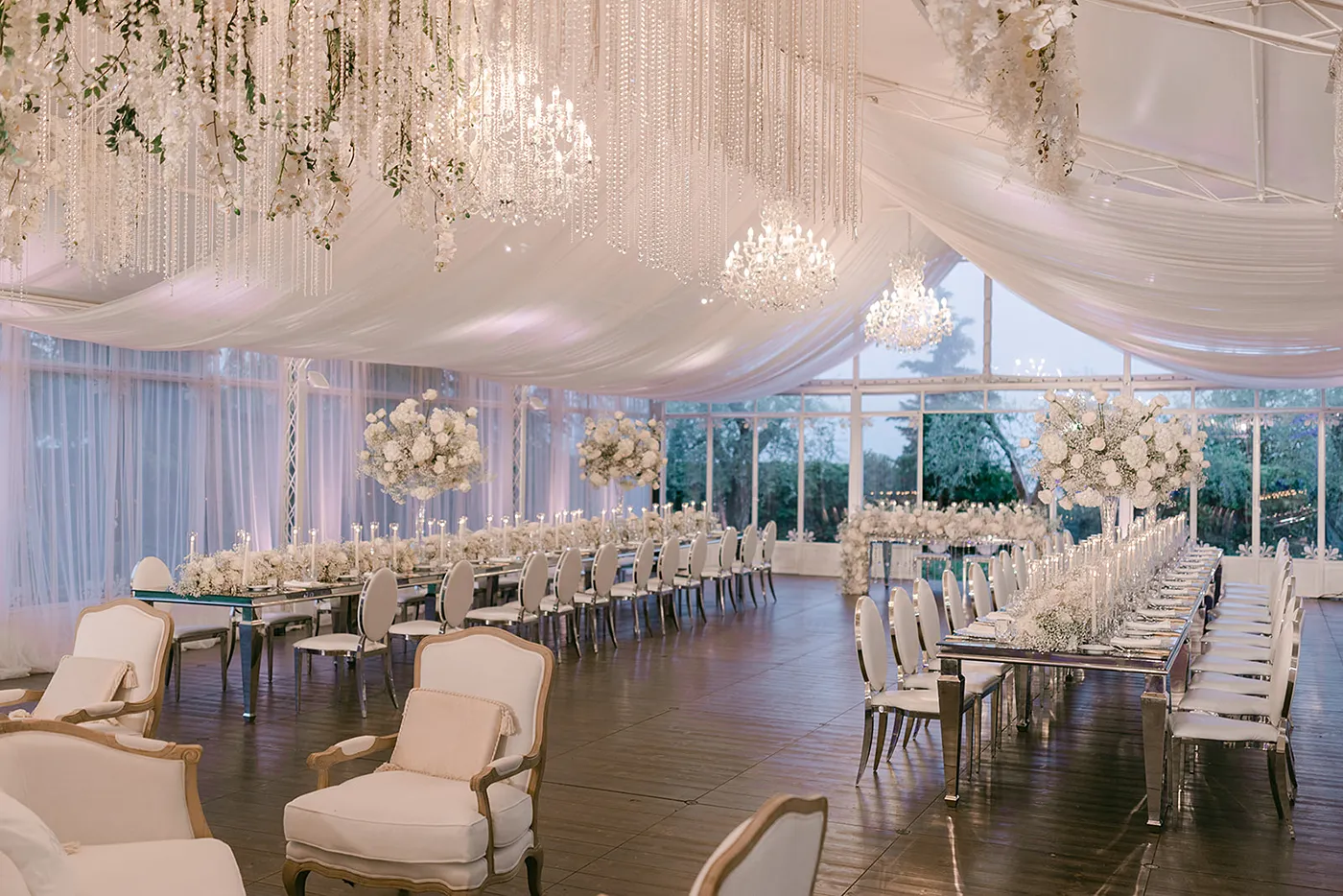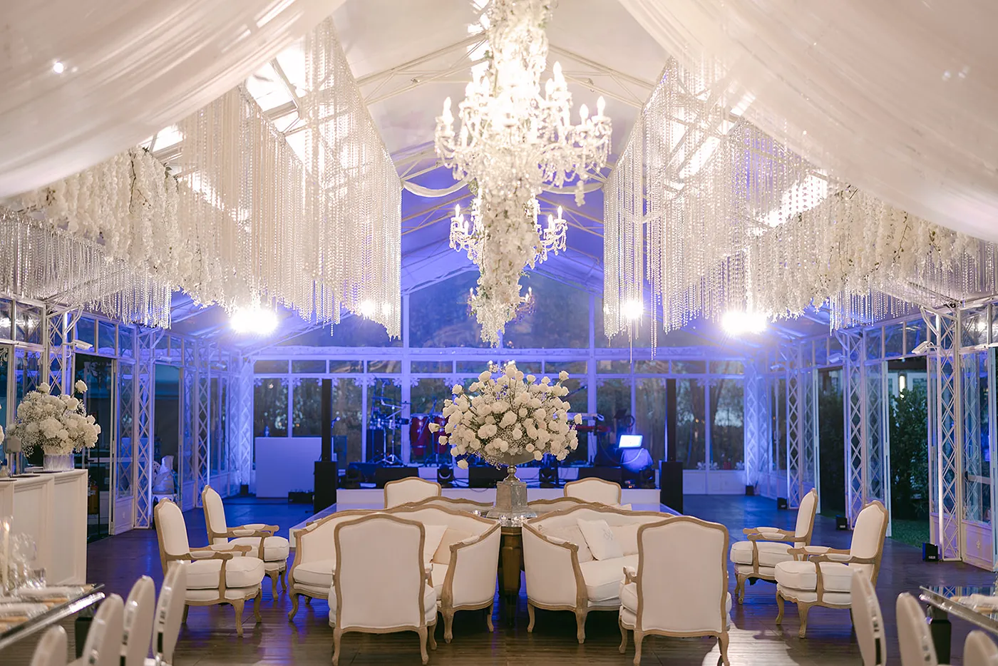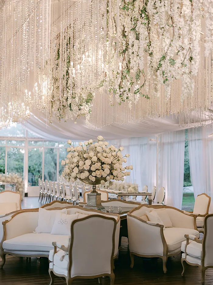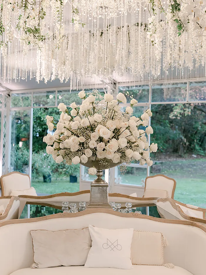 The decorations we crafted for the most special day of their celebration featured thousands of ivory roses, shimmering diamonds and pearl cascades, and a striking mirrored aisle for the ceremony in the loggia overlooking the lake. For the reception, the marquee in the park was transformed with meters and meters of white silk draping, creating an elegant setting for the imperial mirrored tables. What better sweet ending than a monumental wedding cake adorned with cascading flowers and pearls, completing a perfect day of romance and luxury.
