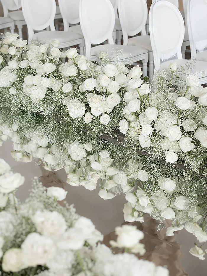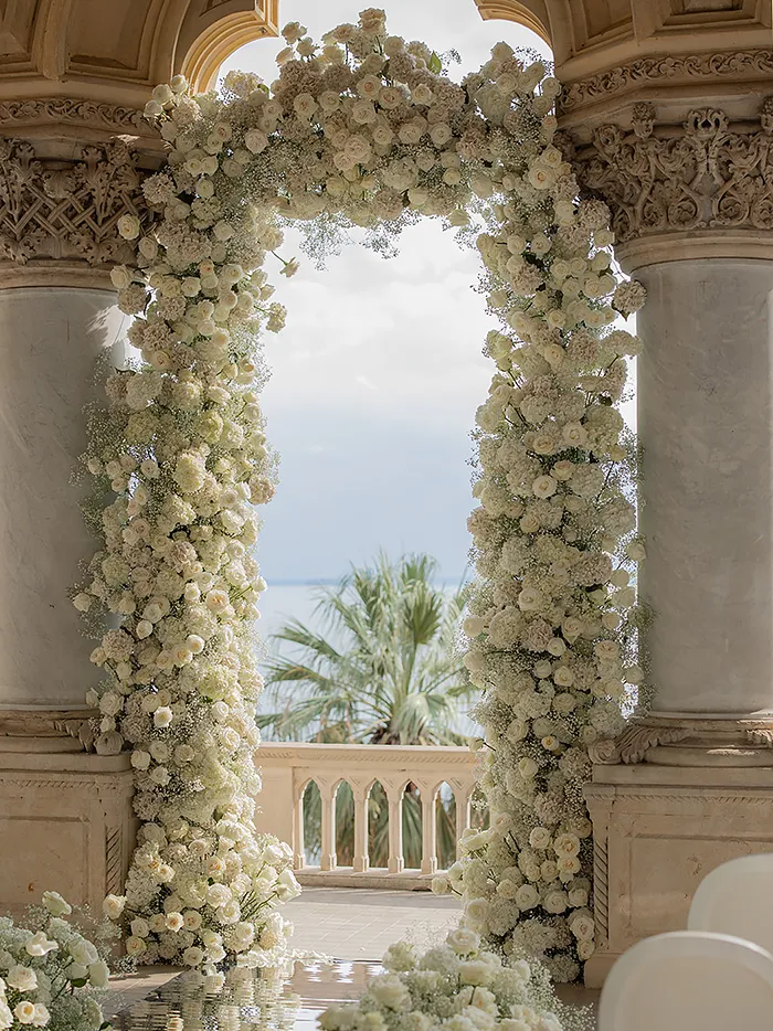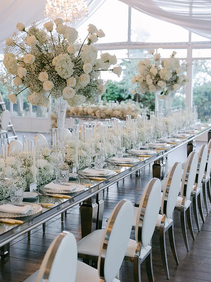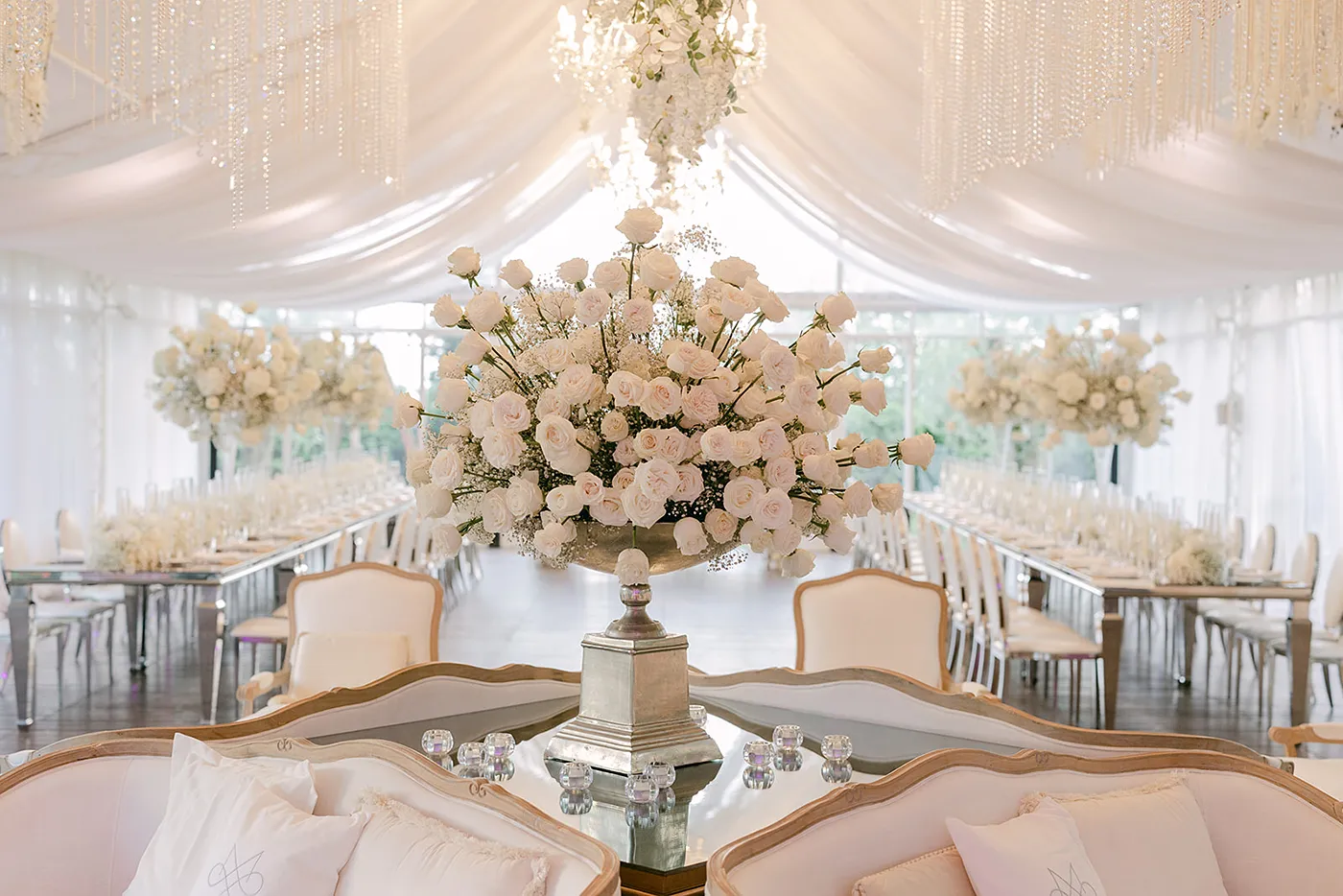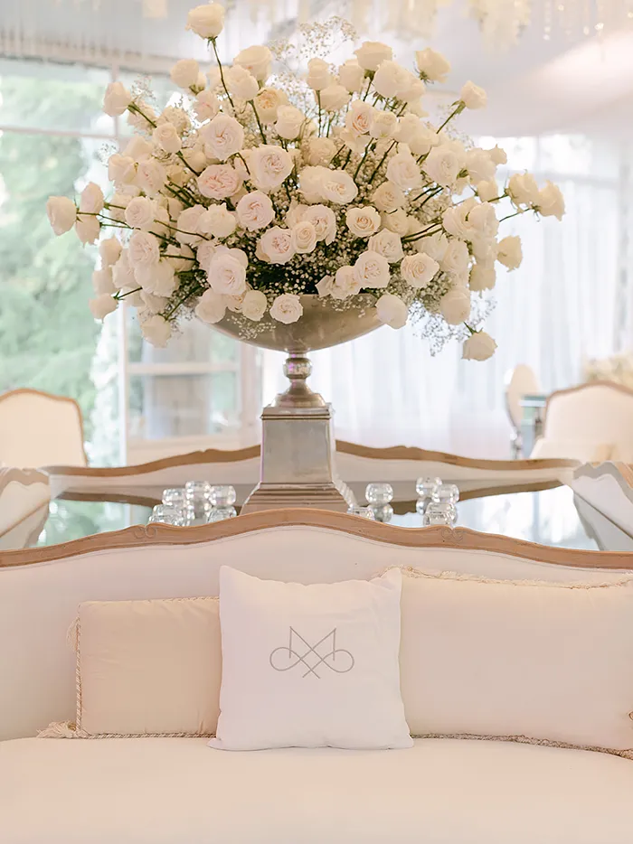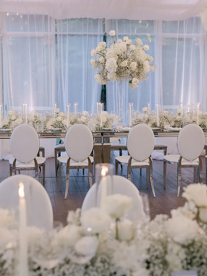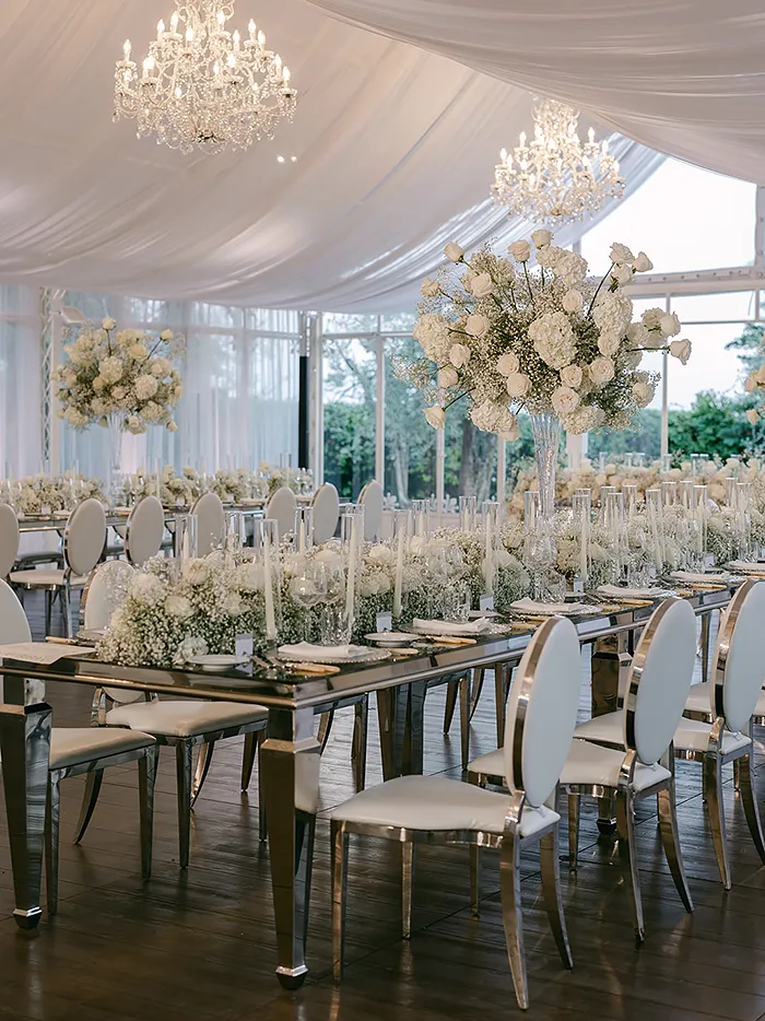 The decorations we crafted for the most special day of their celebration featured thousands of ivory roses, shimmering diamonds and pearl cascades, and a striking mirrored aisle for the ceremony in the loggia overlooking the lake. For the reception, the marquee in the park was transformed with meters and meters of white silk draping, creating an elegant setting for the imperial mirrored tables. What better sweet ending than a monumental wedding cake adorned with cascading flowers and pearls, completing a perfect day of romance and luxury.