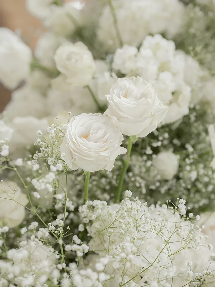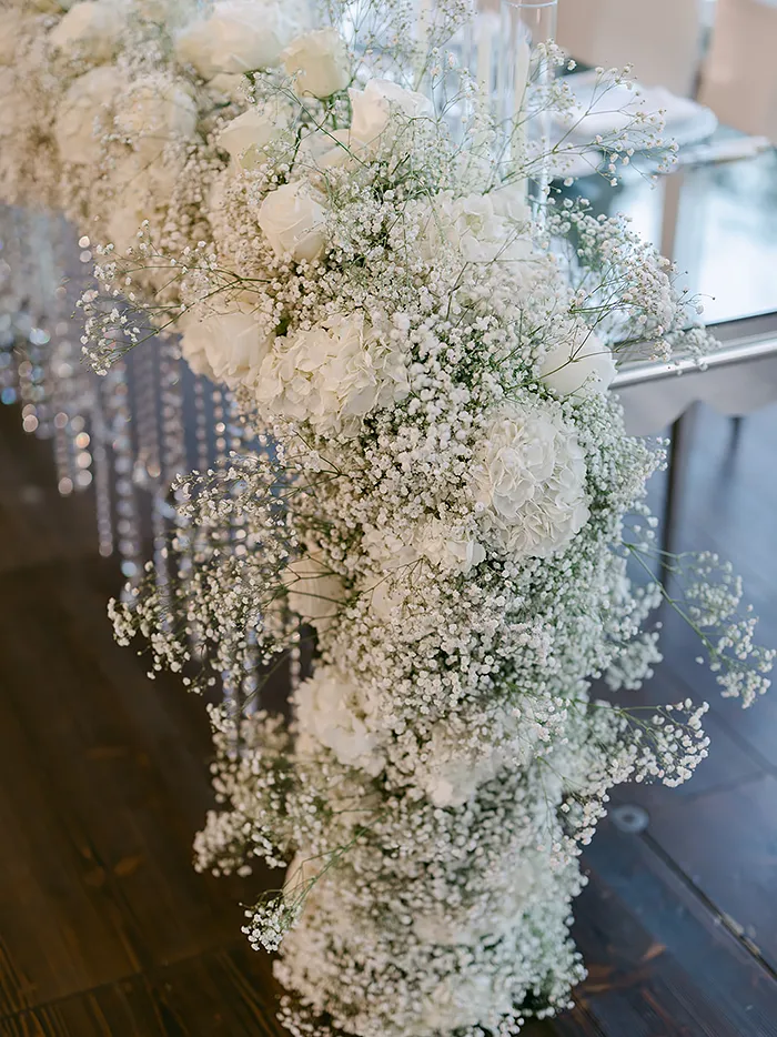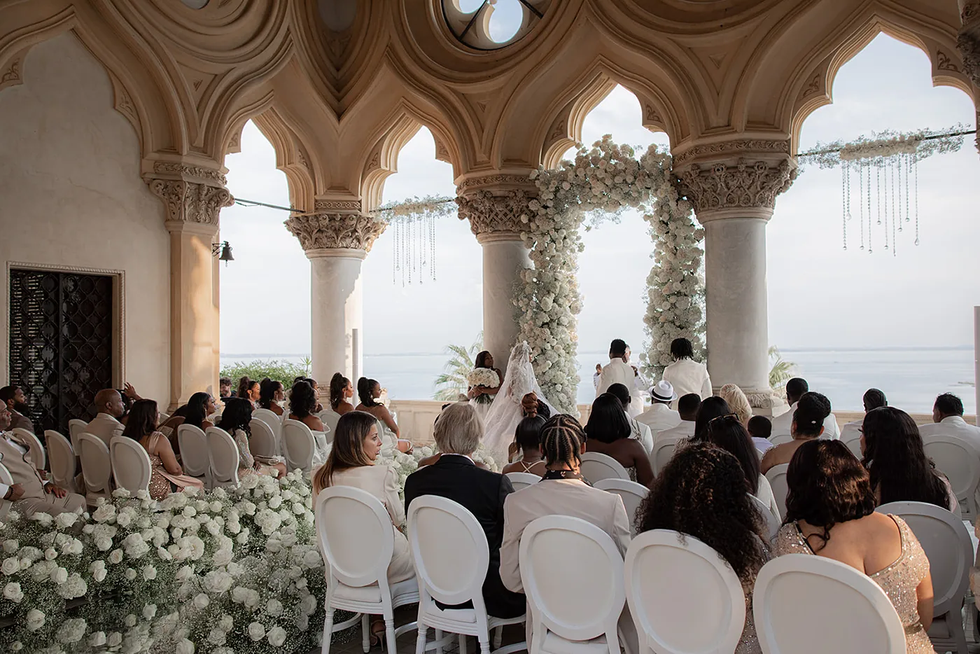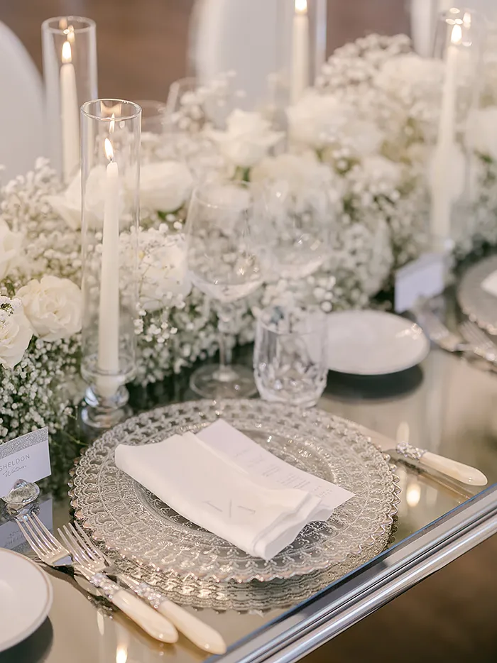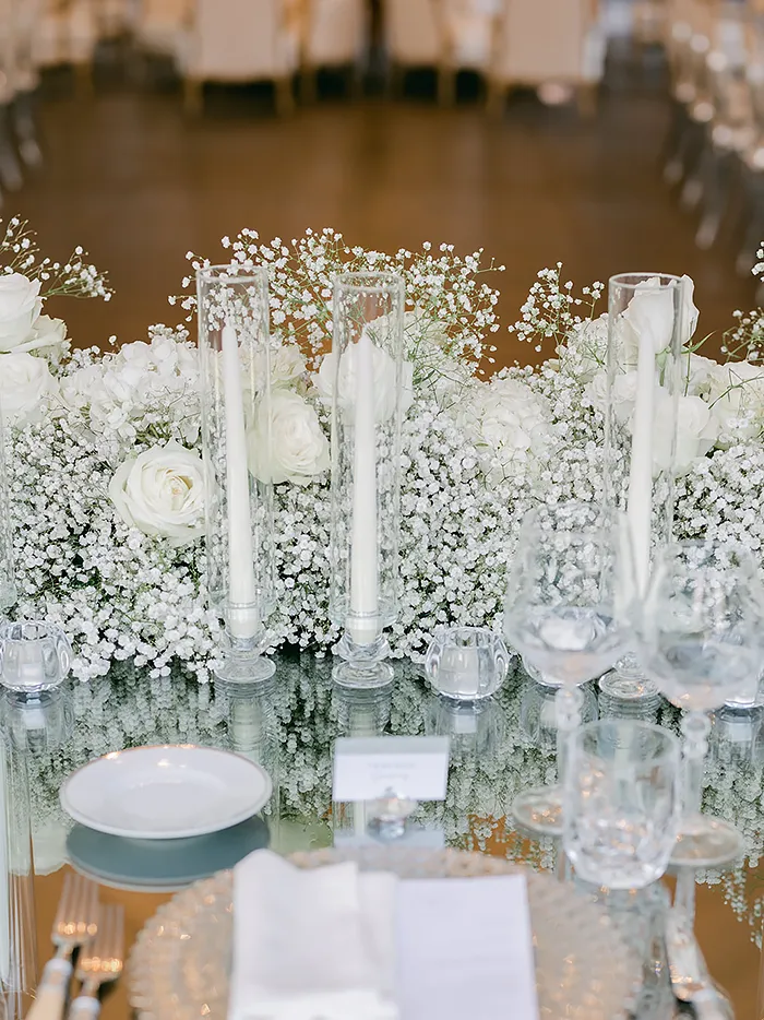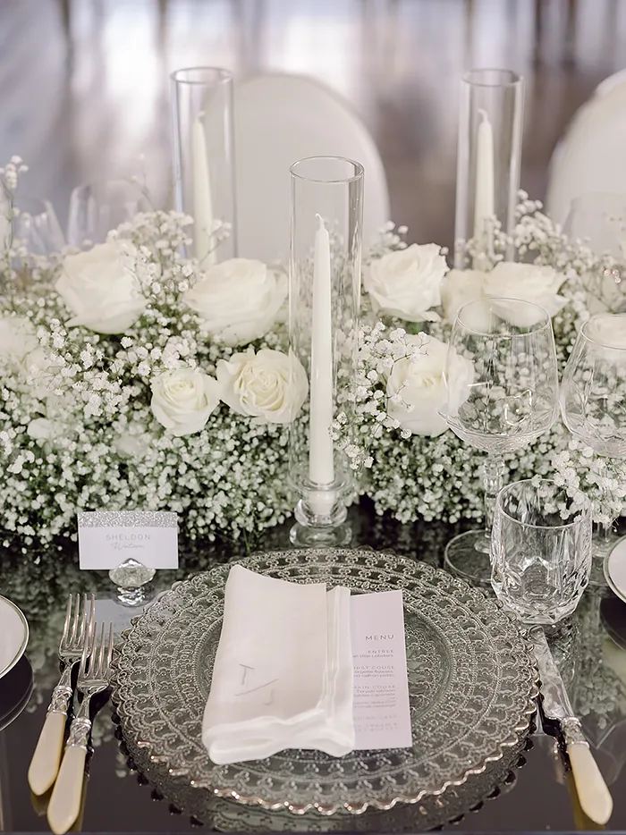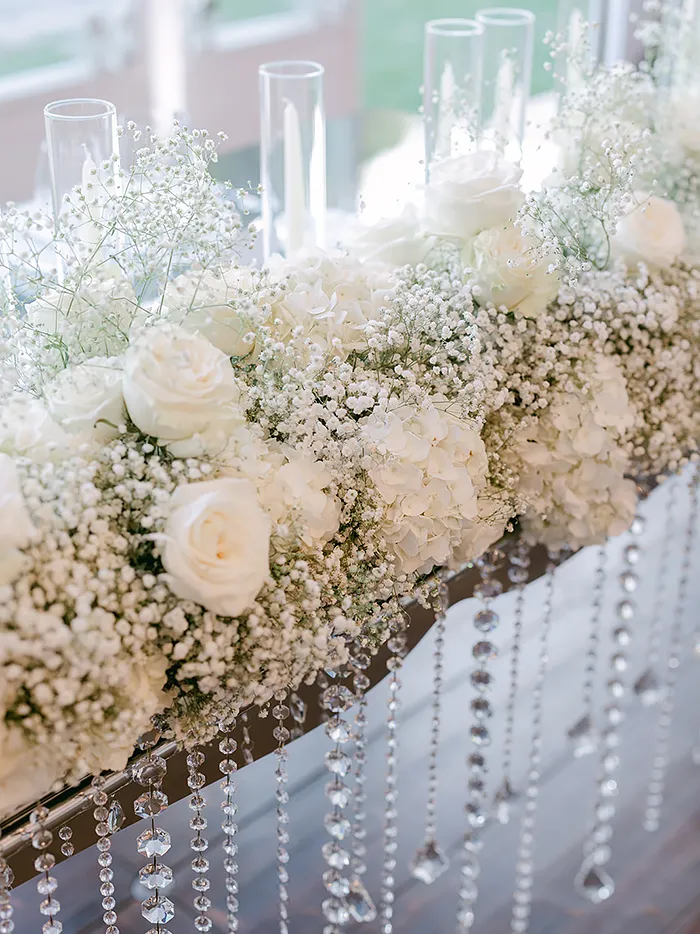 The decorations we crafted for the most special day of their celebration featured thousands of ivory roses, shimmering diamonds and pearl cascades, and a striking mirrored aisle for the ceremony in the loggia overlooking the lake. For the reception, the marquee in the park was transformed with meters and meters of white silk draping, creating an elegant setting for the imperial mirrored tables. What better sweet ending than a monumental wedding cake adorned with cascading flowers and pearls, completing a perfect day of romance and luxury.