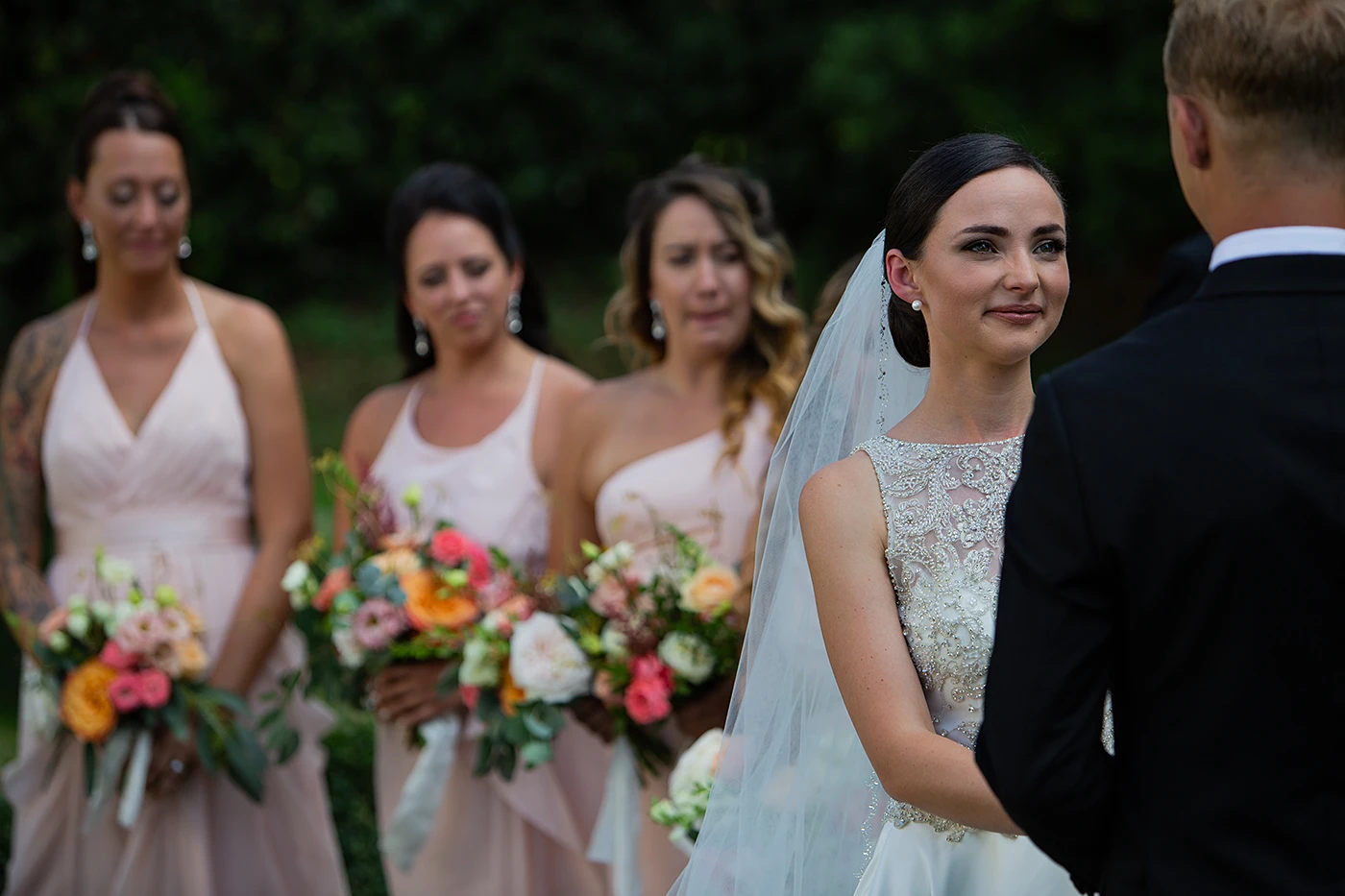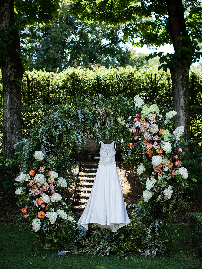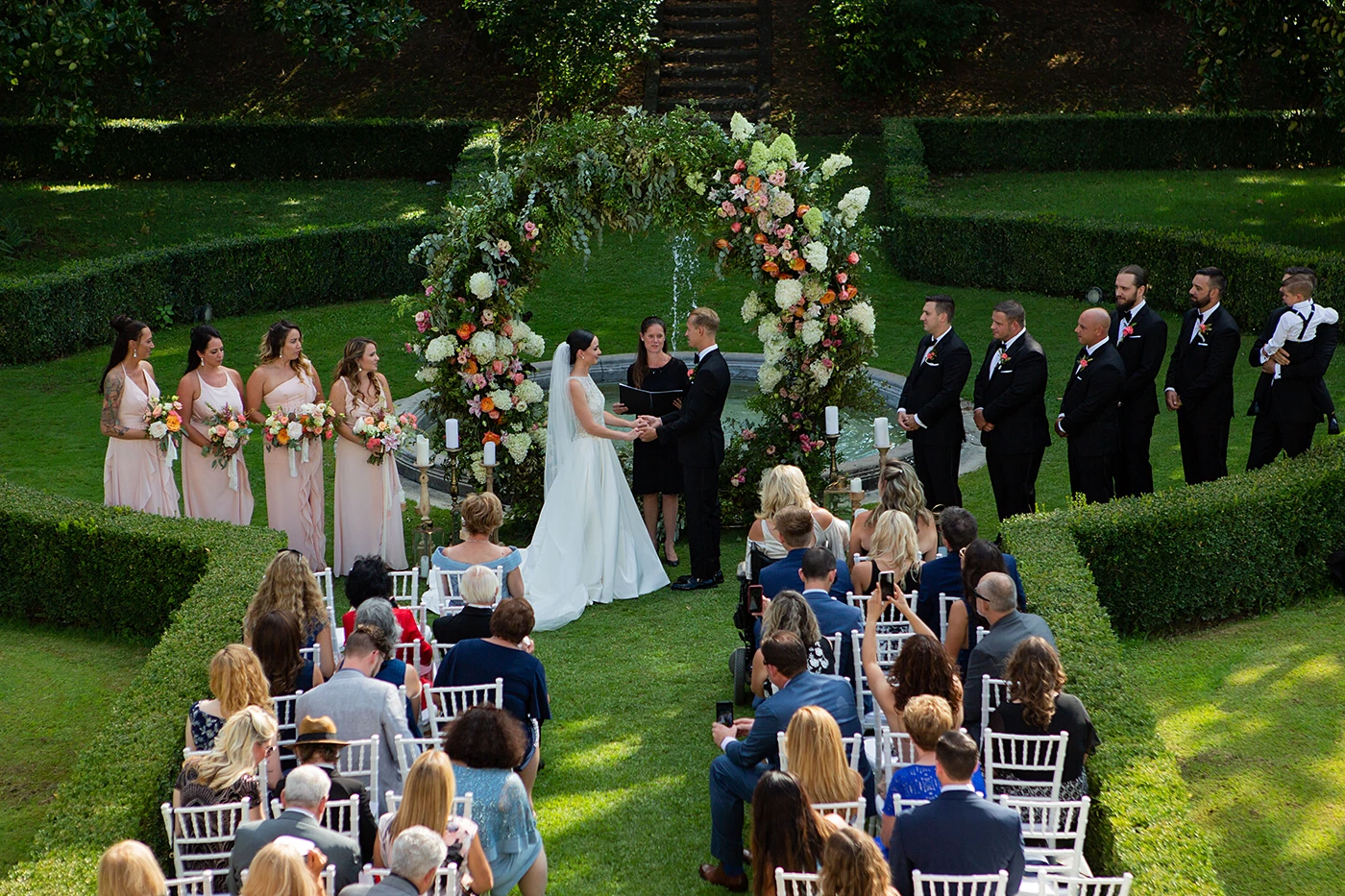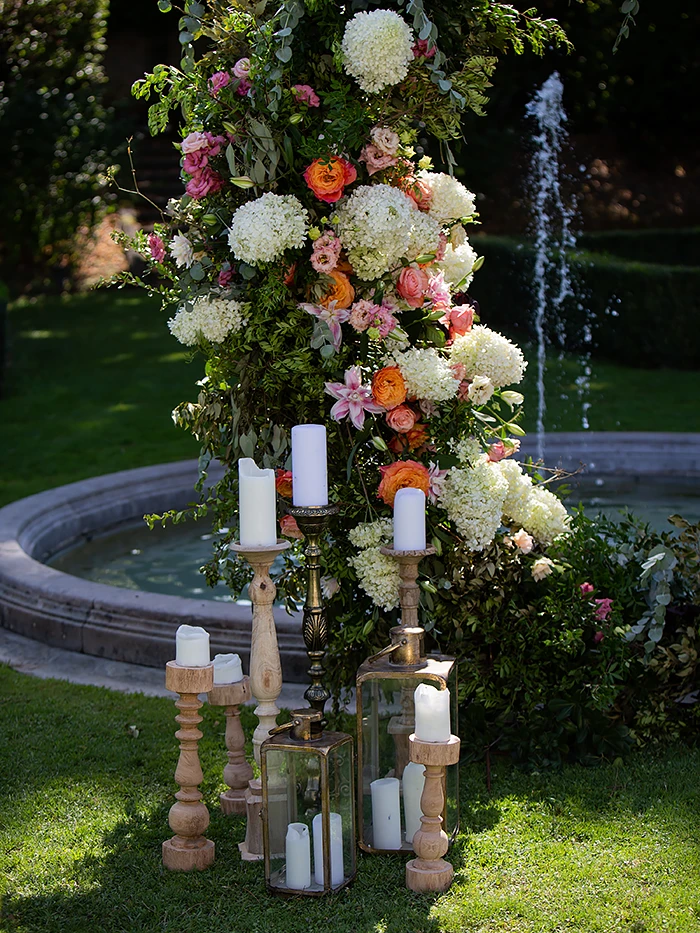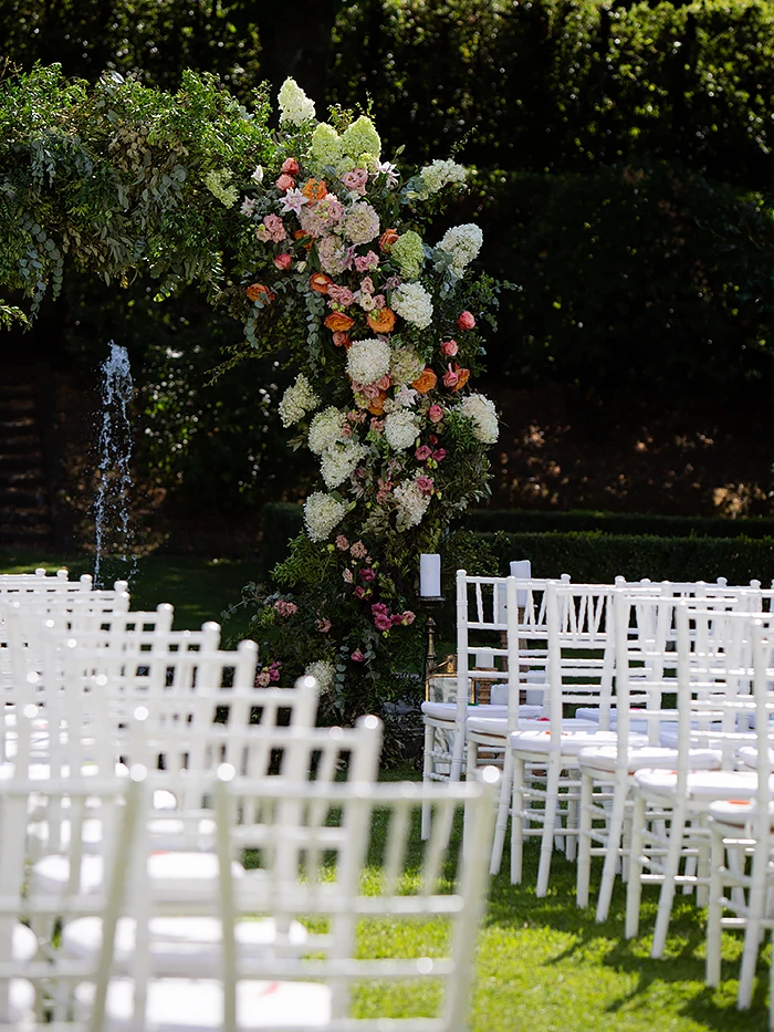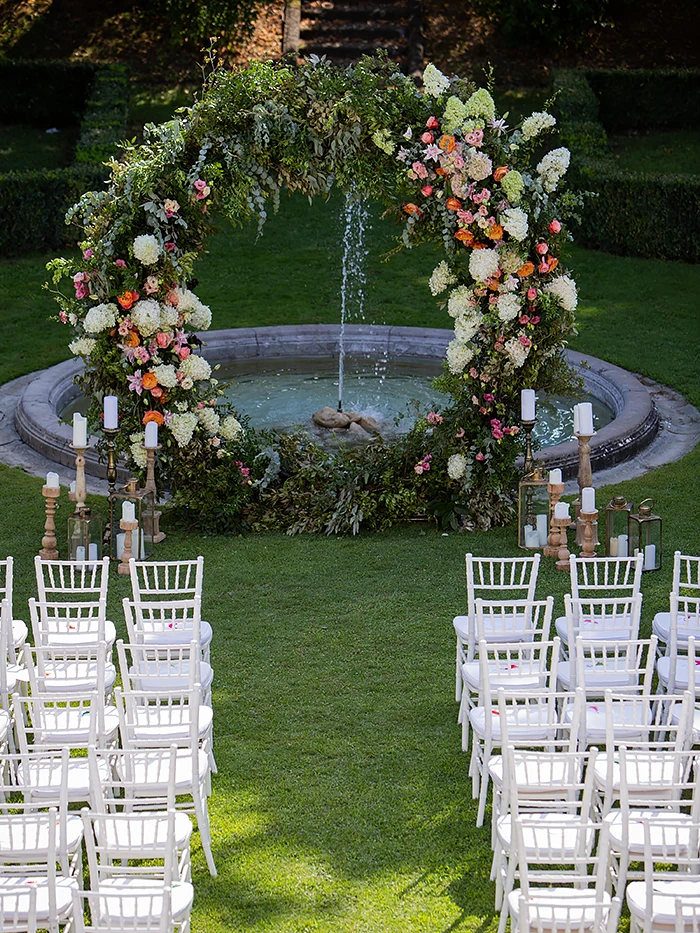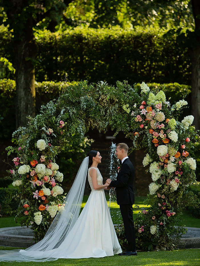 The result was a celebration where energy and style danced together. The ceremony unfolded beneath a lush, colorful floral circle in the lovely garden. Dripping blooms in coral, peach, hot orange, and pink echoed the vibrancy of summer fruit, glowing beautifully against the deep green of the garden.