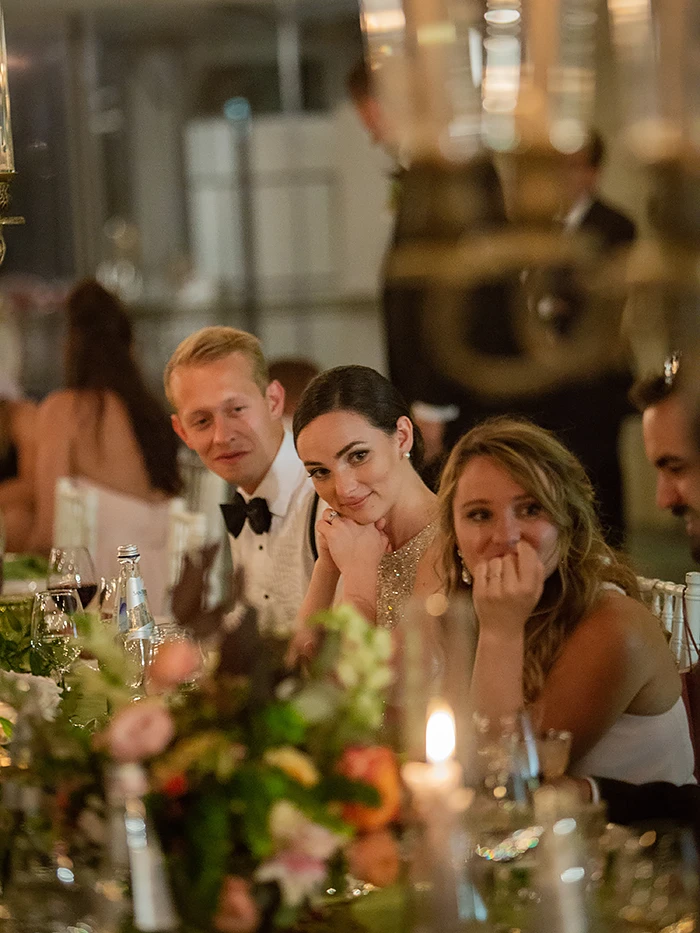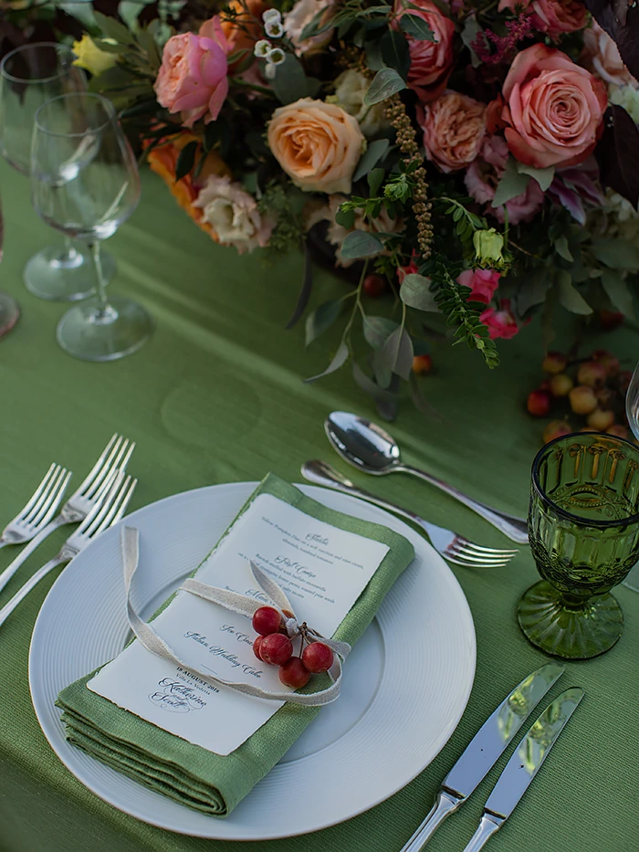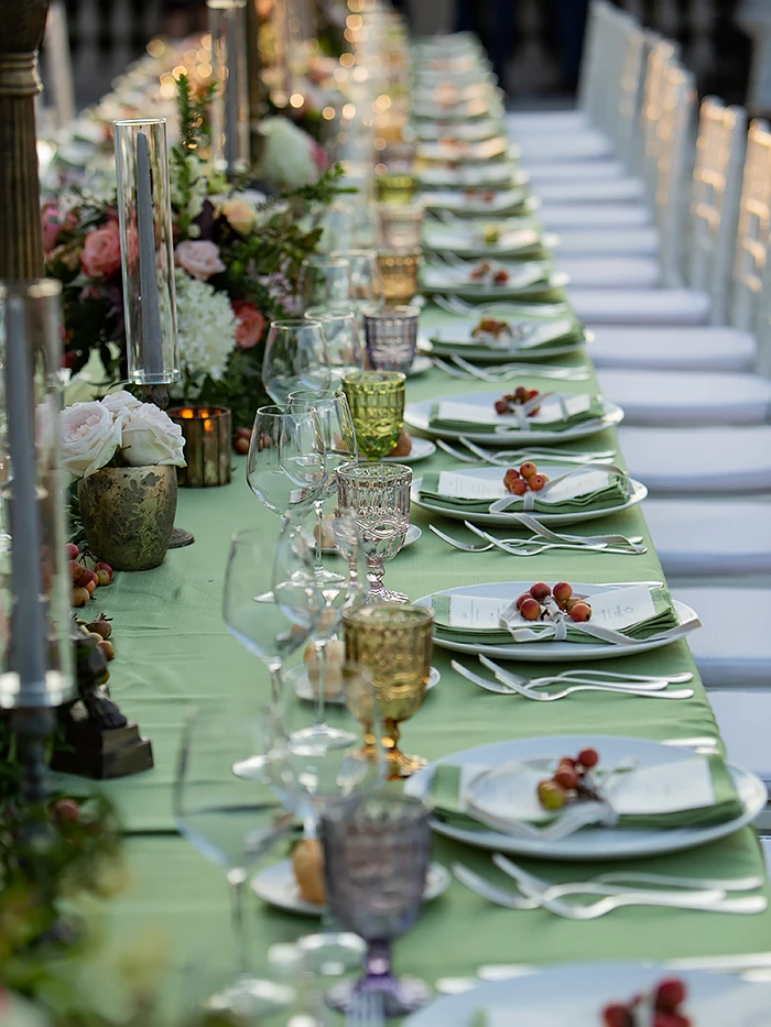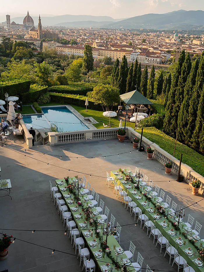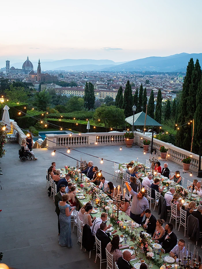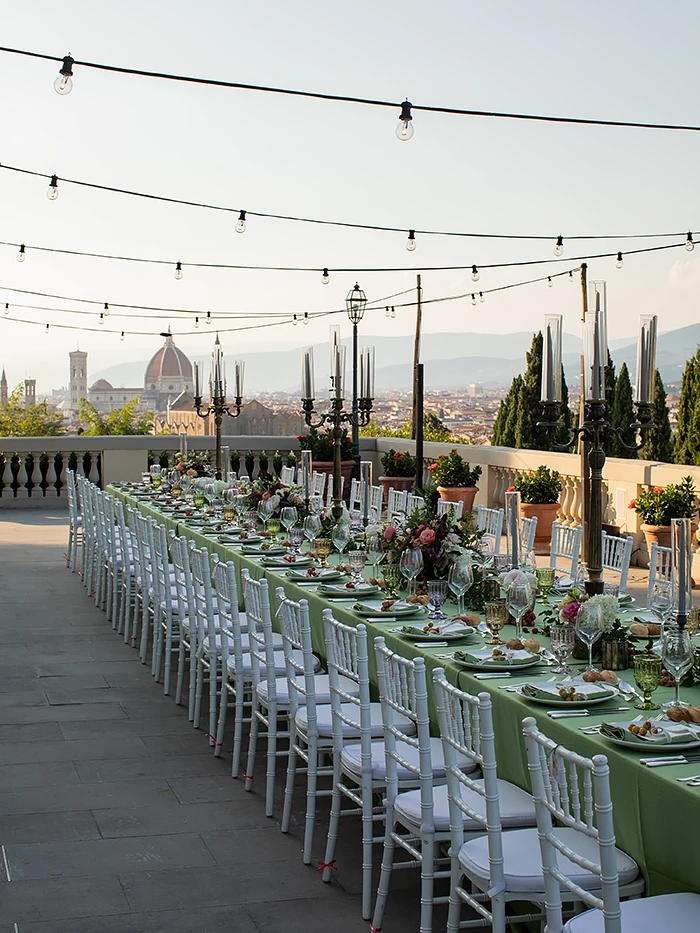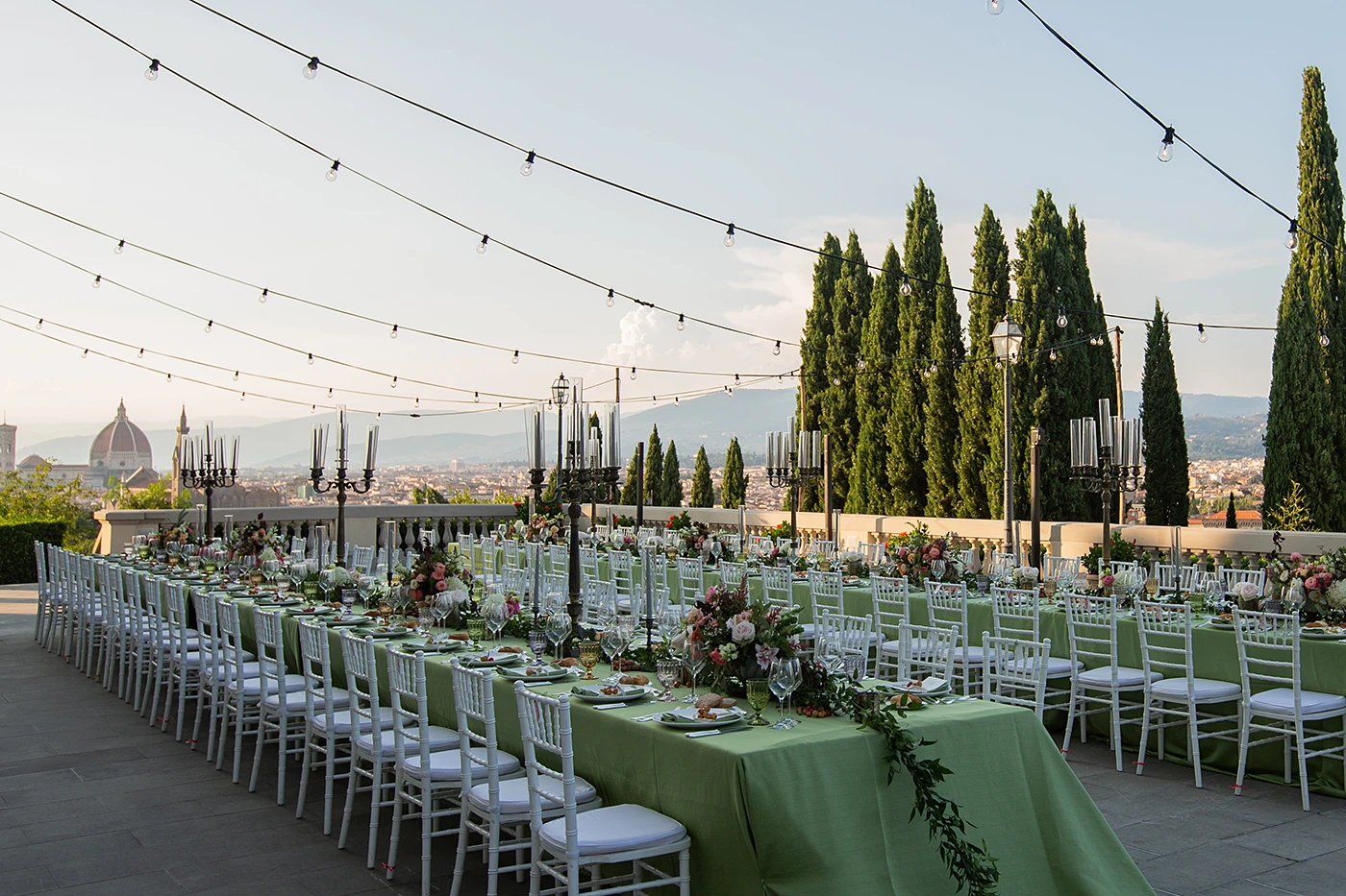As the sun dipped over the city, guests moved to two elegant long tables dressed in a cheerful yet polished shade of green—an elevated backdrop for the florals cascading down their centers. And beyond it all, the iconic dome of Florence watched over the evening, adding a layer of magic that felt almost unreal.